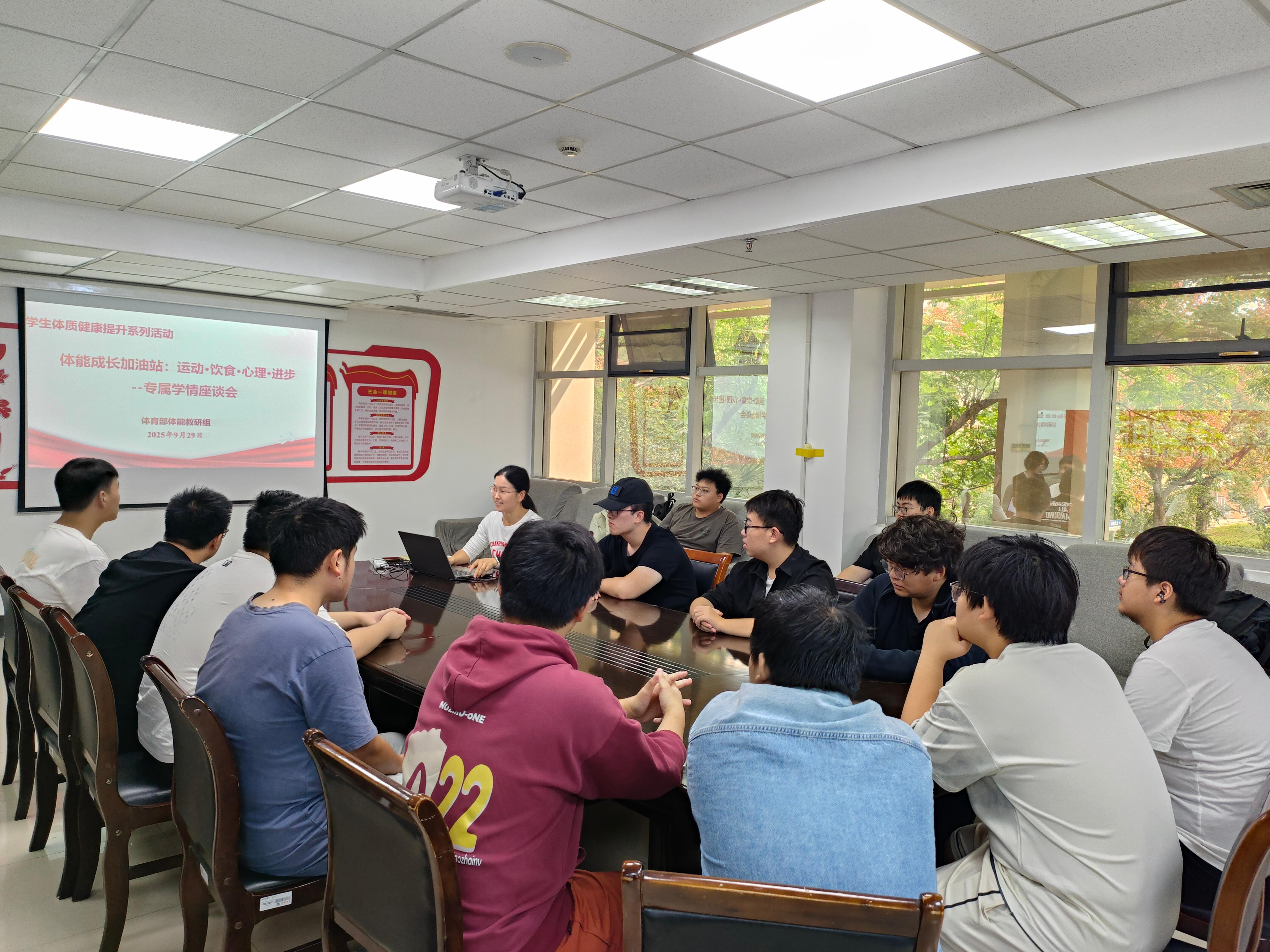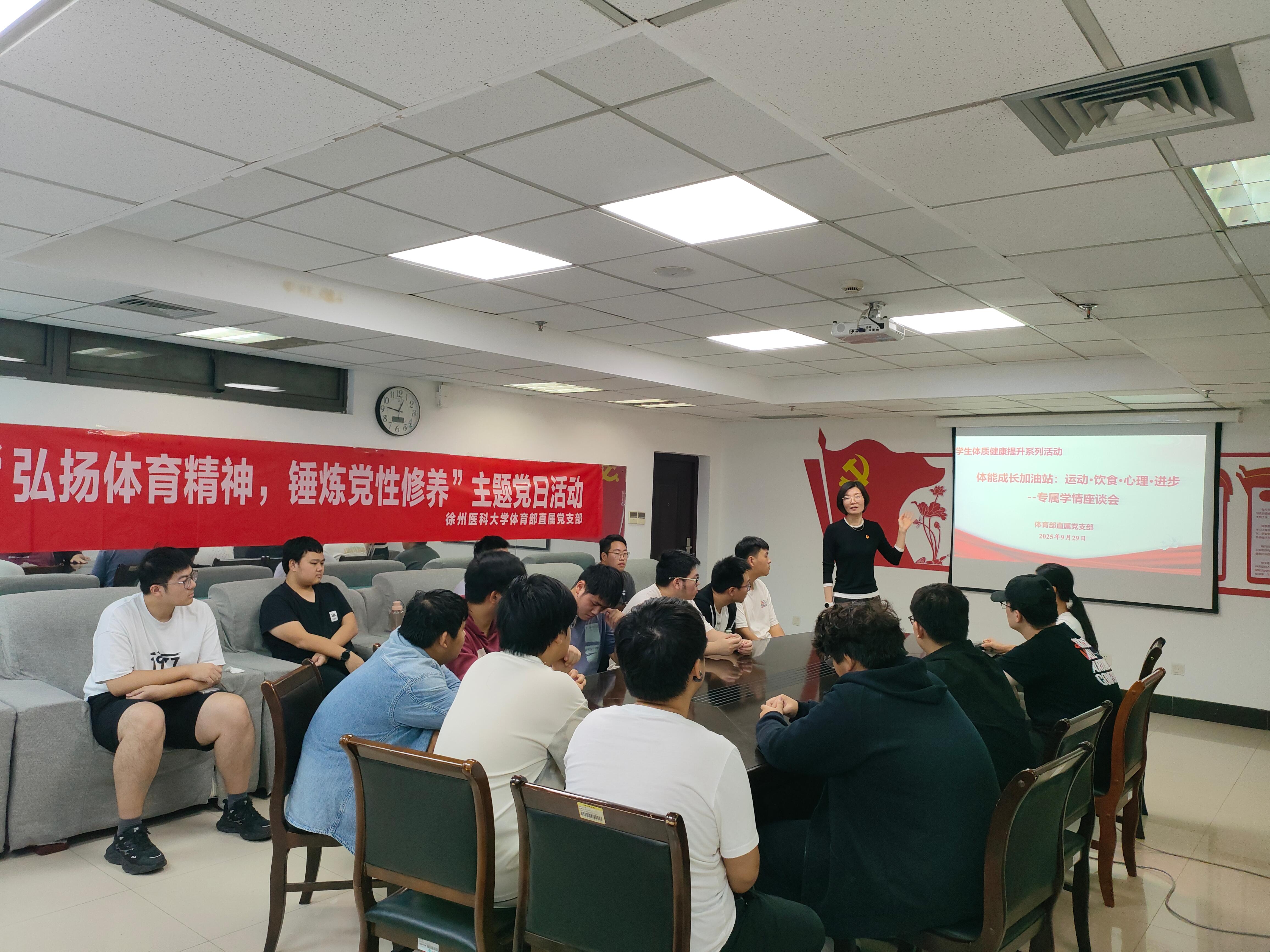 为深入推进“弘扬体育精神,锤炼党性修养”主题党日活动,9月28日,体育部直属党支部在文体中心206会议室组织召开“饮食·运动·心理·进步”专属学情专题座谈会。会议聚焦学生体质健康发展需求,旨在以党建推进精准服务,切实助力提升学生体能。