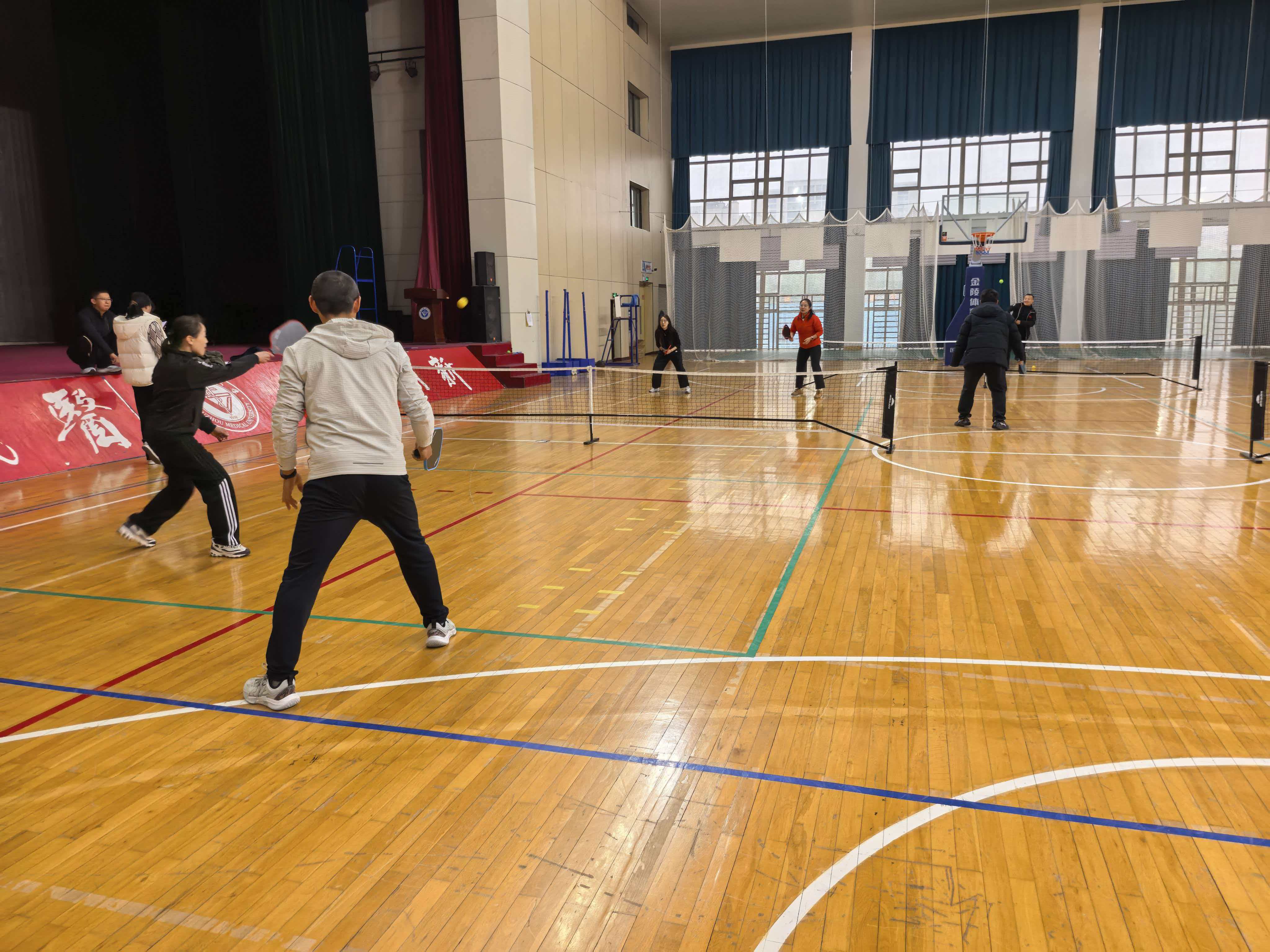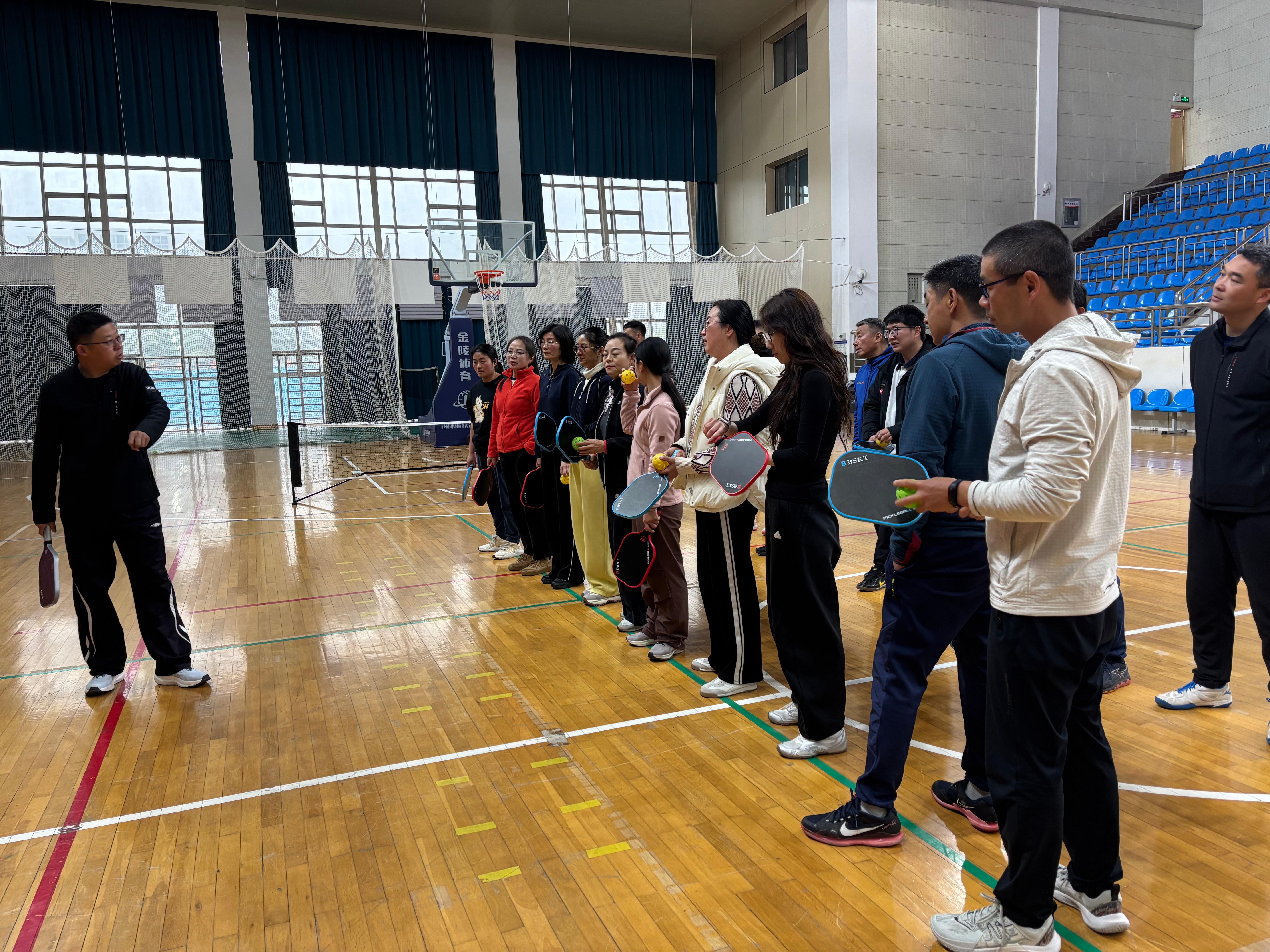 理论讲解之后,全体教师进行了实操体验。,通过在郑老师的指导下,大家分组进行了发球、对打等基础练习,亲身体验了匹克球运动兼具趣味性与竞技性的独特风格。。活动中笑声不断,互动频繁,许多老师表示,通过亲身参与,对这项运动有了更直观的感受,也为日后开展相关教学积累了宝贵经验。
